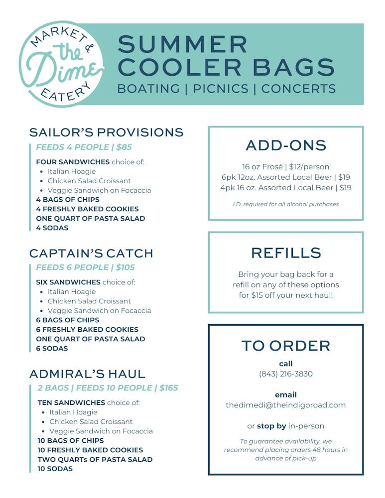 We're teaming up with The DIME to bring you everything you need to fill your cooler bags (including the bag!). Perfect for boating, picnics, football games, or the Daniel Island Fall Guitar Series, our summer cooler bags come with sandwiches, chips, cookies, pasta salad, and drinks.